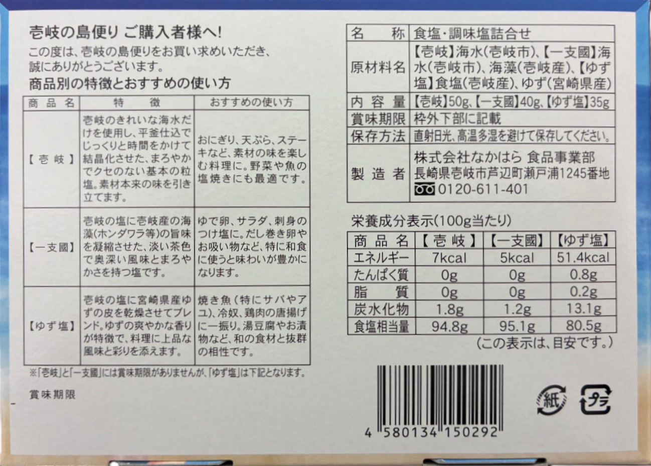 内容量:【壱岐】50g、【一支國】40g、【ゆず塩】35g