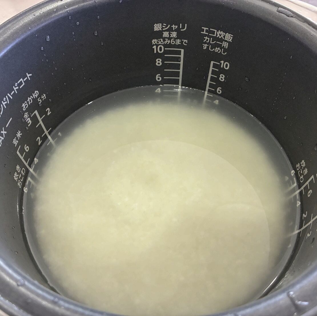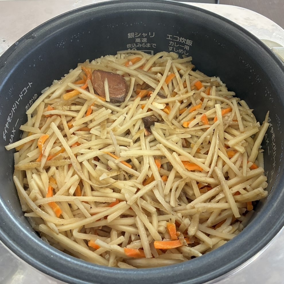 ① お米をとぐ ⇒ ② 2合分の水を入れる(お好みで水加減) ⇒ ③ 具材と『乾燥野菜』をのせる ⇒ ④ スイッチON!※炊飯状況(お米をとぐ→出来上がり)の参考画像は、5合用の量です。