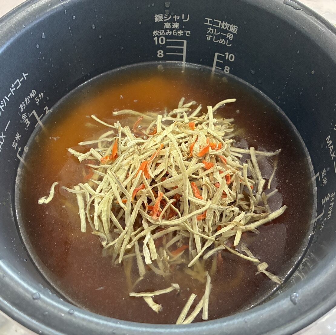 ① お米をとぐ ⇒ ② 2合分の水を入れる(お好みで水加減) ⇒ ③ 具材と『乾燥野菜』をのせる ⇒ ④ スイッチON!※炊飯状況(お米をとぐ→出来上がり)の参考画像は、5合用の量です。